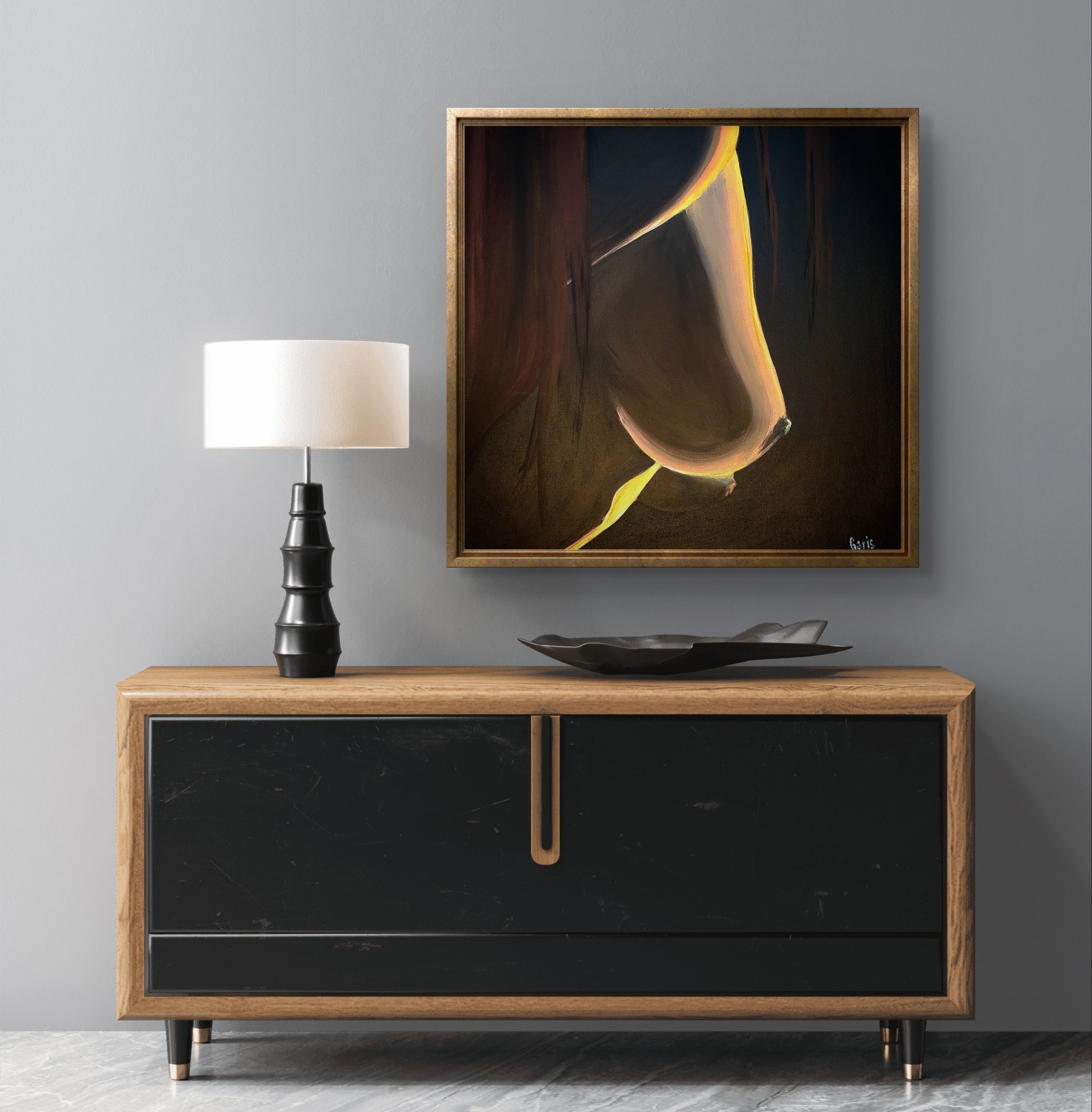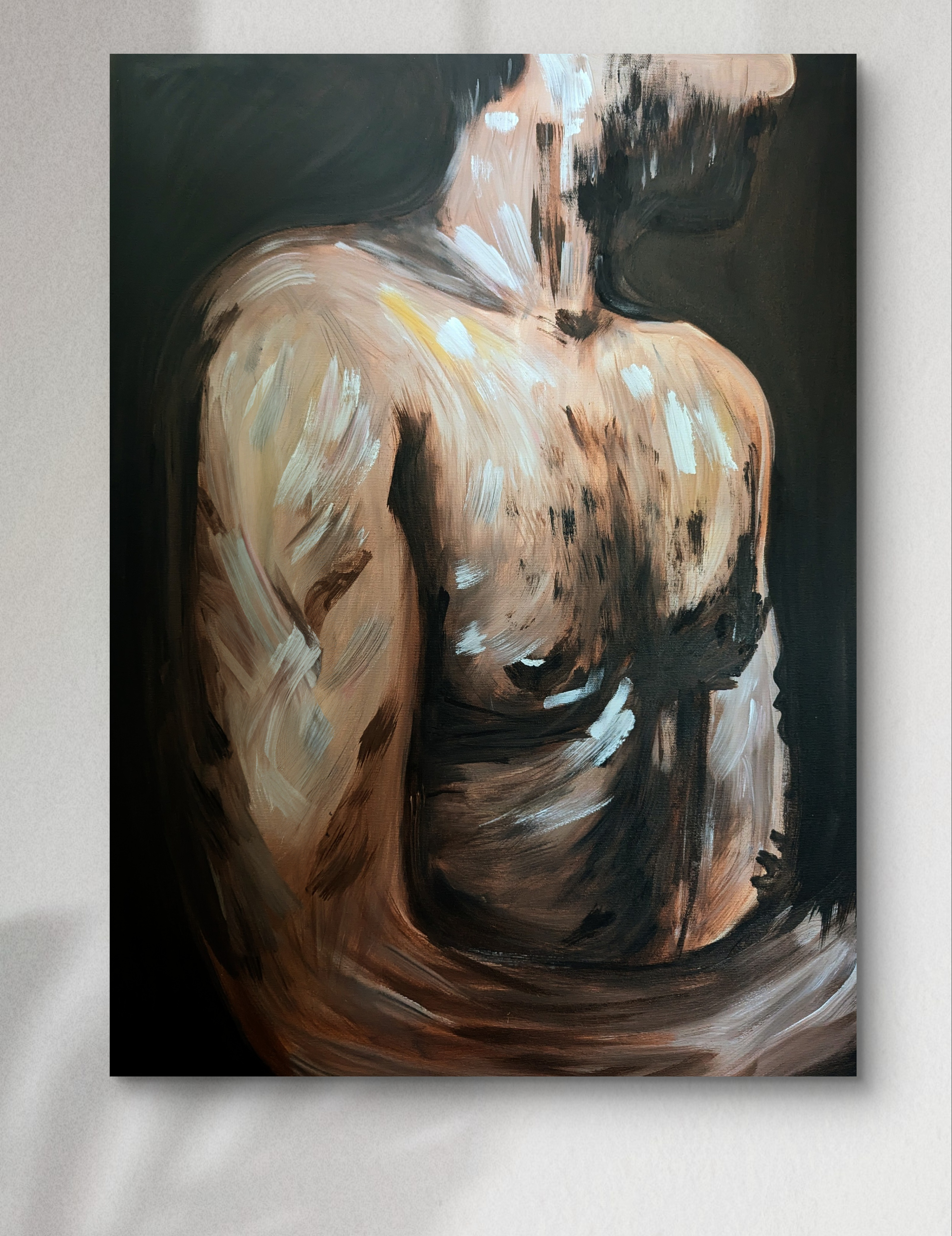 This original acrylic on canvas captures an anonymous figure emerging gently from the dark. Only a faint light touches the body, revealing delicate contours while most of the form remains hidden in shadow.