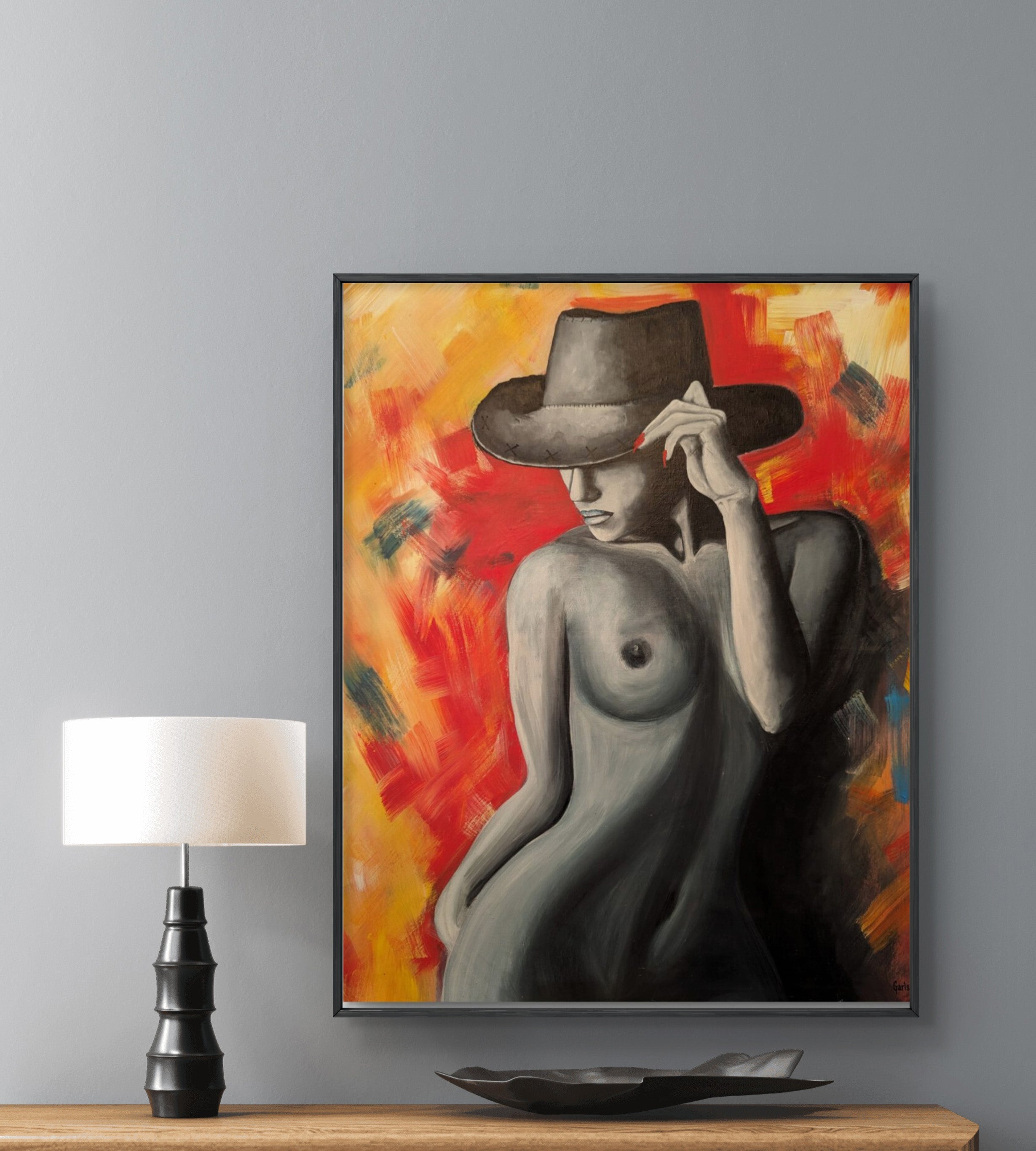 This original acrylic on canvas portrays a woman caught between two worlds. Painted in black and white, her body represents the woman in the shadow, silence, and resilience, while the vibrant background of reds, yellows, and oranges suggests the chaos of battle unfolding around her. She shields her eyes beneath a wide-brimmed hat, a gesture of both vulnerability and defiance. Though she feels exposed (naked within the storm) her posture radiates strength. She chooses to remain in the shadows, yet her presence is a force of confidence against the conflict.